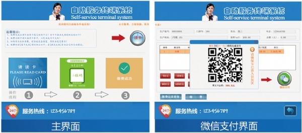 实现自助缴纳水费、电费;支付方式目前支持微信支付,可扩展支付宝和银联卡支付;可实现票 据打印。产品分为壁挂式、落地式等;可实现24小时无人值守工作;